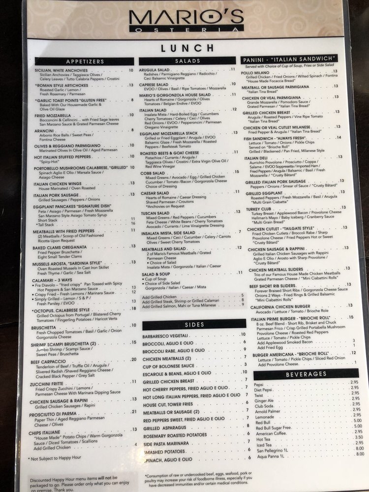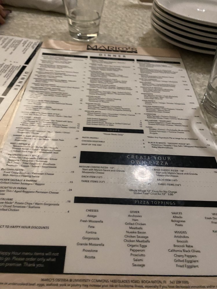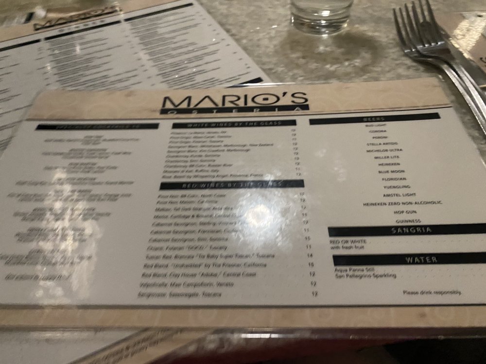 Welcome to Mario’s Osteria, a charming blend of Italian and New American cuisine nestled in Boca Raton. Known for its inviting atmosphere and bustling vibe, this restaurant is perfect for any dining occasion, from casual lunches to lively dinners. The diverse menu showcases an array of delectable dishes ranging from artisanal pizzas to vibrant seafood and pasta options, making it a haven for both meat lovers and vegetarians alike.
